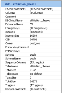 PostgreSQL schema, lists out the tables, columns, indexes,