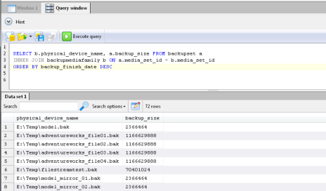 generated by SQL BAK Explorer. The file hints quickly tell you
