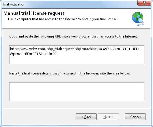 On the next page, an activation URL is provided to you. You can use this URL on another Internet-enabled device to retrieve your trial activation details.Use this URL on another Internet-enabled device to retrieve your trial activation details.Once you have obtained the trial license details, paste the details into the provided area. Click Next.The product will then inform you that the trial license has been successfully activated. If you encounter any problems, please drop us a line at support@yohz.com.
